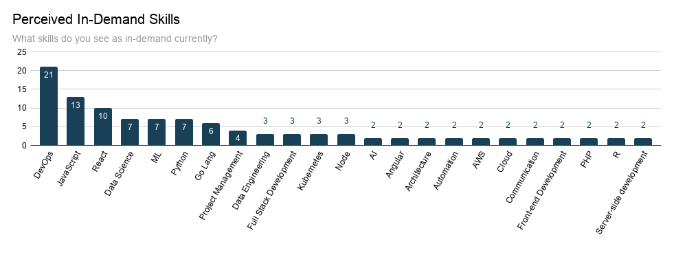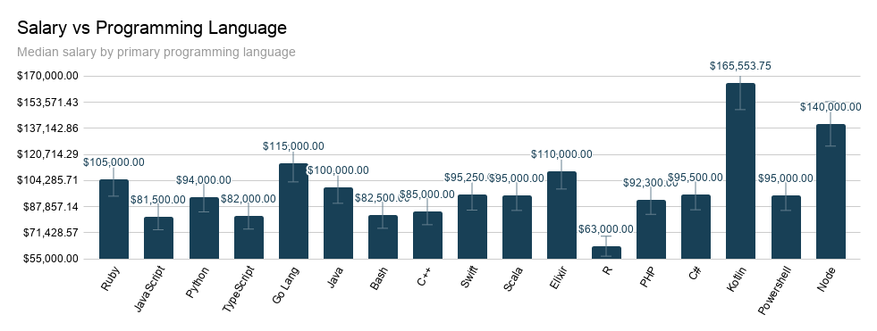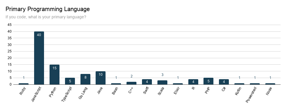 JavaScript, Python, Java, Go Lang, PHP, Typescript, R, C#, Scala, Swift round out the top ten languages